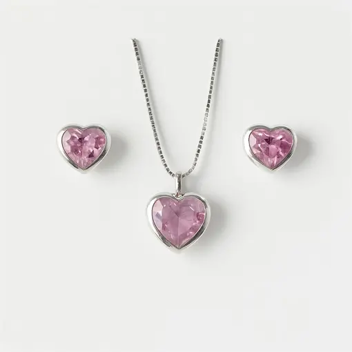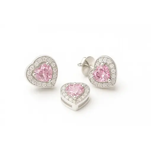 CONJUNTO DE PRATA CORAÇÃO ROSA CLARO